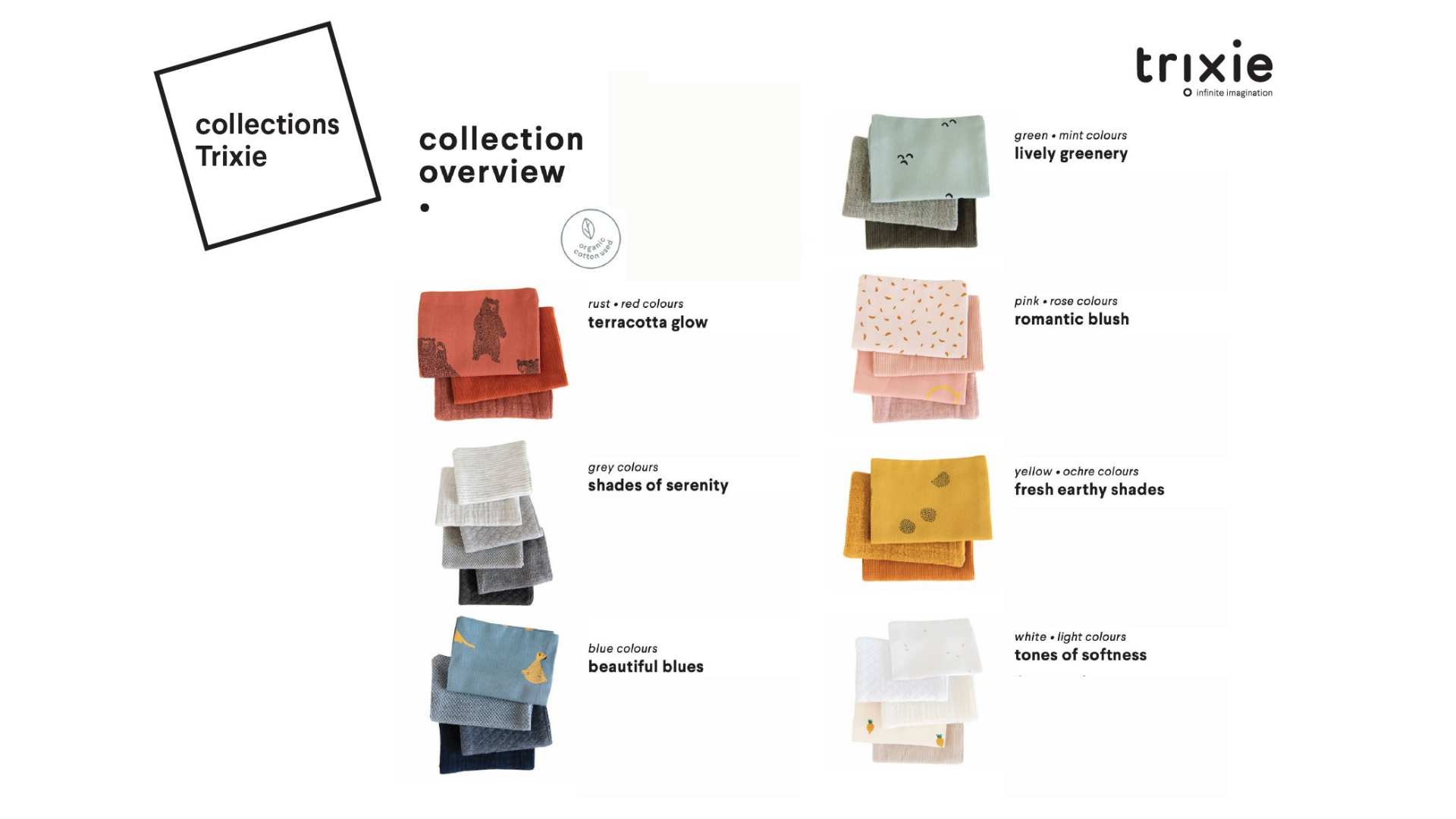 Ma passiamo alla gamma. Con Trixie è impossibile resistere alle decine di decorazioni, di prodotti per la nanna, la cameretta, per andare a spasso con mamma e papà e per creare infine, l’atmosfera domestica desiderata, ad ogni livello di crescita.